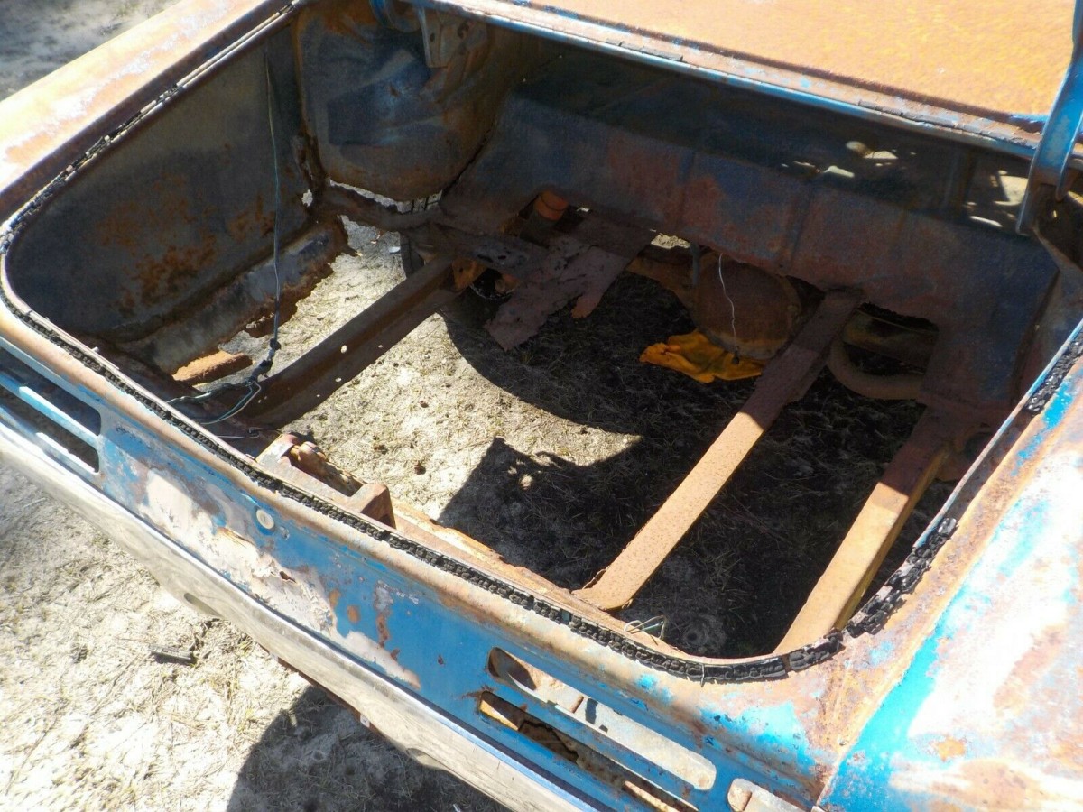 Rust is a big issue with this automobile, one that the seller doesn’t want to undertake even though he’s owned a body shop for more than 45 years. The floorboards are said to be decent, although someone started a DIY repair on the fronts and some holes still remain. We’re told the frame is in good condition, though it does have surface rust. The trunk, however, is a see through model. The only parts of the interior that seem to be around are the dashboard, console and front bucket seats. If other pieces still survive, they’re not pictured. And don’t get your heart set on the hood scoop vent as that has since been sold.
