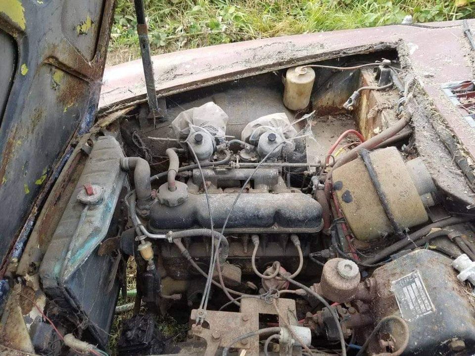 That history would suggest that this car was actually assembled in Sweden, and I think I see an “1800S” badge on the tail. But all the early cars had very different trim, including “bullhorn” front bumpers, early-style hubcaps, and “curved spear” side trim. Maybe that engine really was rebuilt, though it looks rather sorry for itself now.