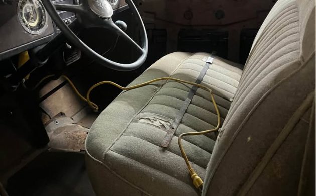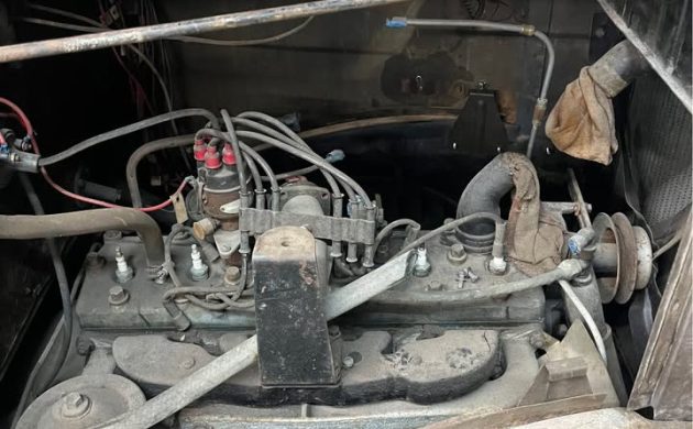 Inside, the Graham provided an upscale experience with mohair upholstery and a unique, plastic center dash section. One large multi-pupose gauge and an equally large clock flank the steering wheel. The seller identifies a rusted-through spot on the cabin’s floor as the only serious corrosion. The car’s badging depicts three knights in semi-profile, homage to the three Graham brothers.