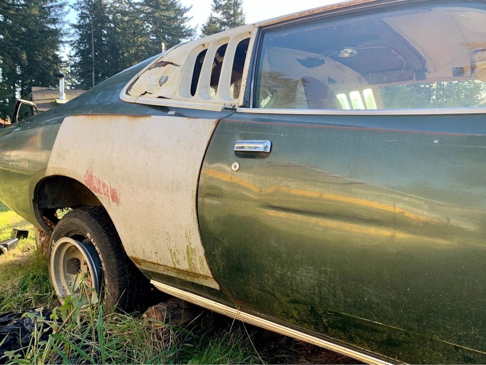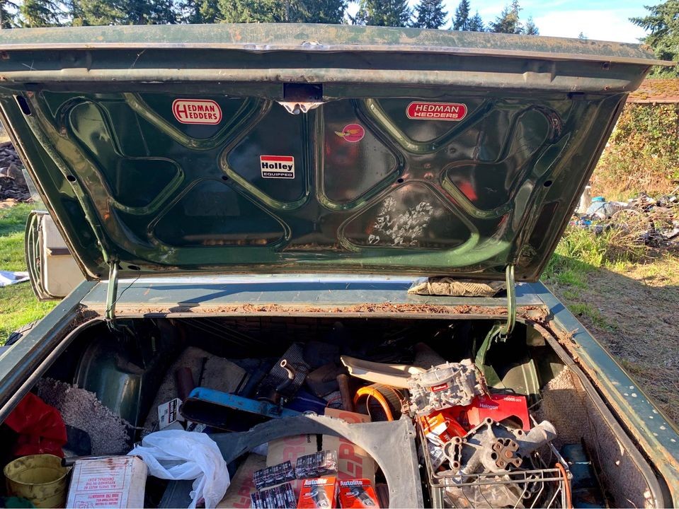 Rust has been reported underneath the aging half-vinyl top and there appears to be some issues around the opera windows. There may be a big patch underneath the passenger side rear window as a big section of primer has been applied and the door on the same side has a healthy crease in it. We can’t talk about the condition of the trunk as it’s literally filled with parts that we assume both fit this car and come with the sale. The only thing that’s said to be missing is the passenger rear window glass, although there is a large pane in the back seat (rear window?).