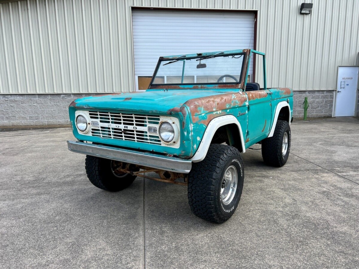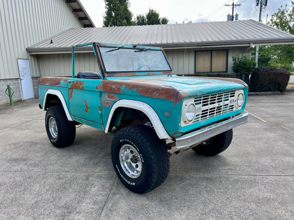 The listing and supplied photos suggest a previous owner may have cultivated the “designer patinated” appearance with this Bronco because the tired Caribbean Turquoise paint and apparent surface corrosion on the doors don’t gel with the seller’s claim that those panels are new. We’ve previously seen classics where a builder has followed that approach, and this may be a case of more of the same. The images confirm that the floors are new and that the frame carries little beyond surface corrosion. The door frames and prone areas like the rear quarter panels and hood are clean, with the only identified rust visible in one rocker and the front inner fender wells. Steel to address those shortcomings is readily available, and with that welded into place, this Ford should achieve a rust-free status. The wheel arches are cut and sport flares to accommodate larger wheels and tires, but reversing those changes as part of a faithful restoration would be pretty straightforward. The trim looks restorable, and there are no glaring glass issues, but it is unclear whether the original top is included.