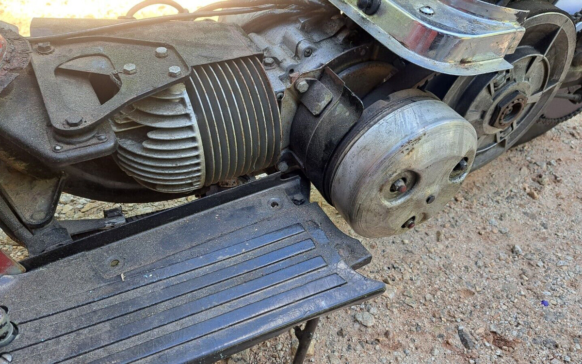 That this one has over 8,000 miles on it is pretty amazing. That’s seven round trips to Sturgis from our house, cool. Speaking of 1,200-mile road trips on a scooter, the seller does have a windshield for this one that isn’t shown, that would be a must. I’ll take my protein in non-bug-in-the-teeth varieties, thanks very much. This Topper has two new tires and tubes and the wheels have been restored, and it also has a new drive belt, new carb, and a new seat cover.