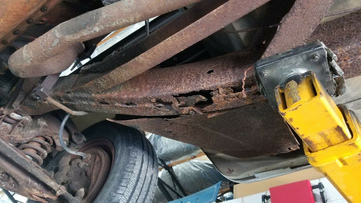 The rusted rear cross member’s no big deal. It’s pretty common for 53-62’s, and is easily corrected. The cross member’s a bolt in part and new repro’s are available for about $525. The rust in the frame rails is another story though. It’s rare to see this kind of rust in early frames. The only other one I ever remember seeing that was that bad, was under a car that had been sitting on the ground for years.
