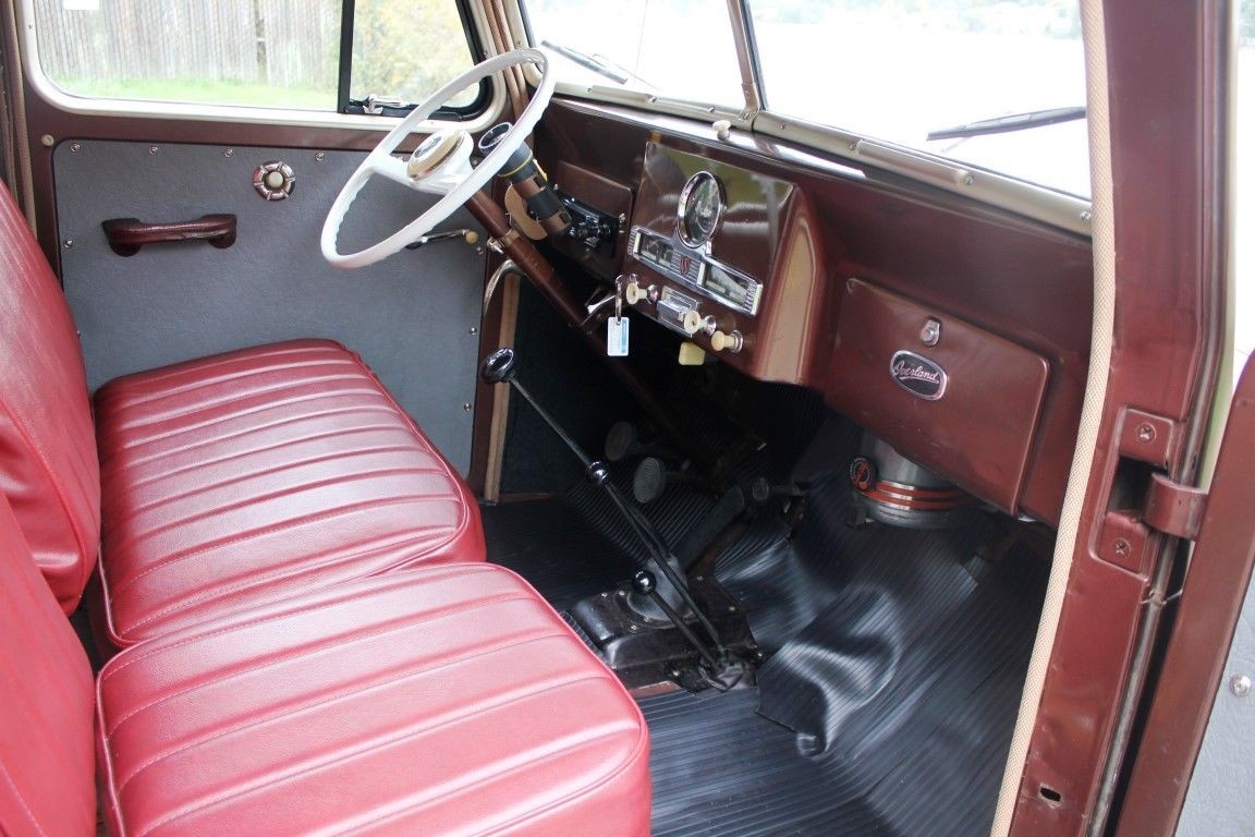 The interior of this beige beast is a nice, deep red splitting bench seat in both the front and rear. According to the listing, there are new seat covers and a headliner. Black aftermarket floor mats cover the floor in the front, but the rear cargo area is left bare. A new radio and antenna have been installed, but are not hooked up and the listing states that it needs speakers. It has a six-volt electrical system.