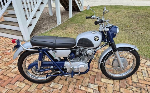 Hagerty is at $4,800 for a #3 good condition example and $8,600 for a #2 excellent bike. At its current bid price, with just a day left, this is a steal. Honda introduced the CL77 in the 1965 model year, and buyers could get one of three colors as far as the headlight bucket, frame, and upper forks went: red, black, or blue, as seen here. They all came with a silver gas tank, side covers, and fenders, no matter what color a customer wanted. 1968 was the last year of production for this model.