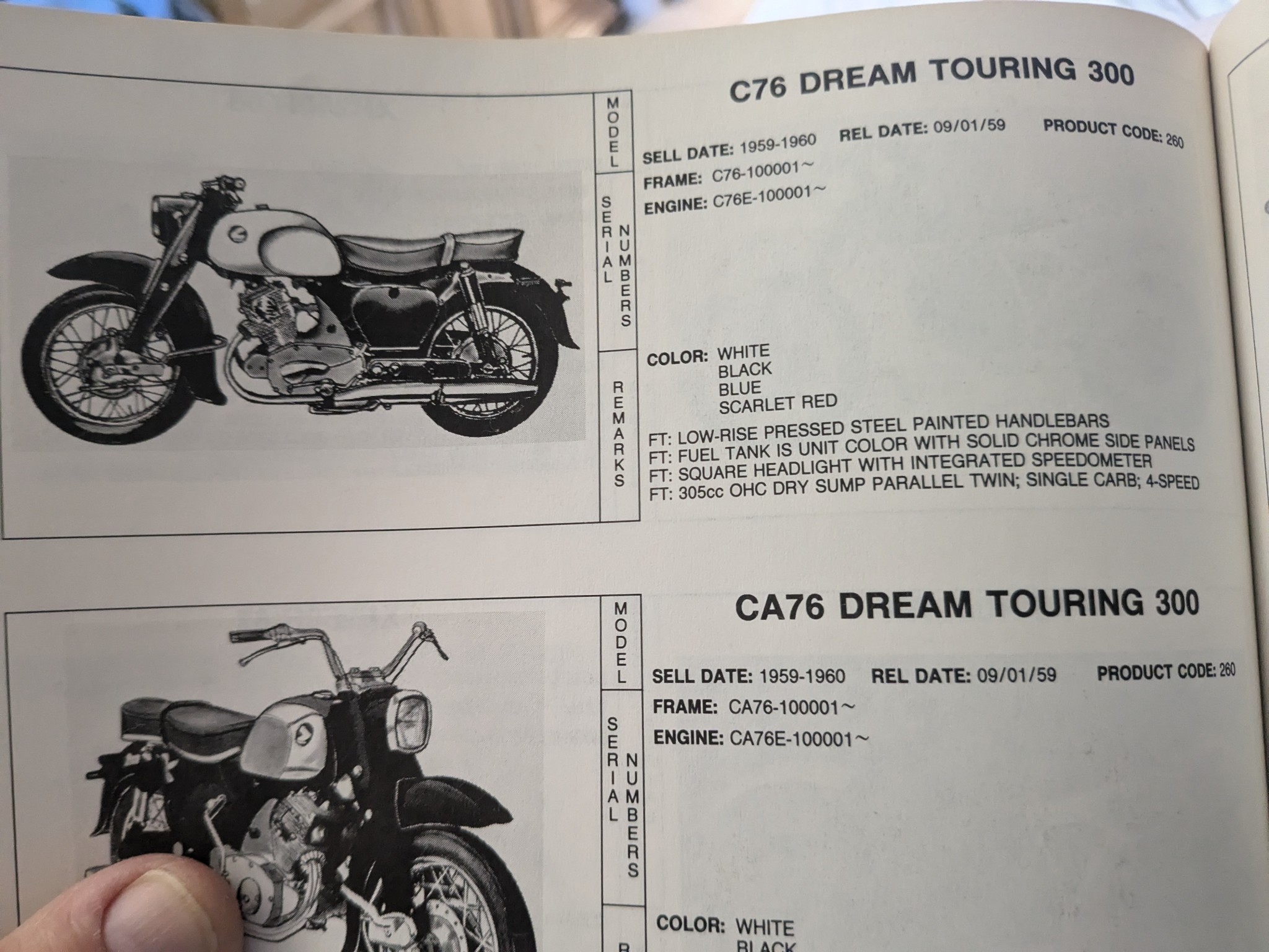 Hey Howard, my official Honda published records I refer to never list a 300 engine. The earliest Honda with a 305cc engine was from 1959 and was listed as a 300, the C76 Dream Touring 300. Interestingly it is listed as a dry sump 305cc engine. 4 models were made in 59 and 60 that used the dry sump engine. Starting in 1961 they designated a new model the CA77 and CB77 and also the CL77 models through 1968. They were all listed as 305 in their model designations. The difference in engine HP and Torque in Scrambler versions was due to a different cam profile resulting in a lower torque curve with with extra pull at lower RPMs. This is why I personally always likes the CL version more be cause of that profile at lower speeds, like 25-45 mph. I don’t ride any more due to age and balance issues, and the last bike I still own is a 1965 305 Scrambler, titled as a 1967. It is unrestored and sadly soon to be put up for sale.