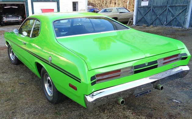 The seller reports that this undertaking went on for many years, with the visionary initially selecting the nicest Duster he could find as the base. It’s never revealed what color this one began life as, but I believe that’s now Chrysler FJ6 green paint the sheet metal is wearing, one of the High Impact offerings known as Sassy Grass for Plymouths. This hue works great here, and it’s also favorable that the seller indicates only a few rust repairs were required. The black stripes complement the bright paint nicely, and the hood scoops add a menacing appearance to the front view.