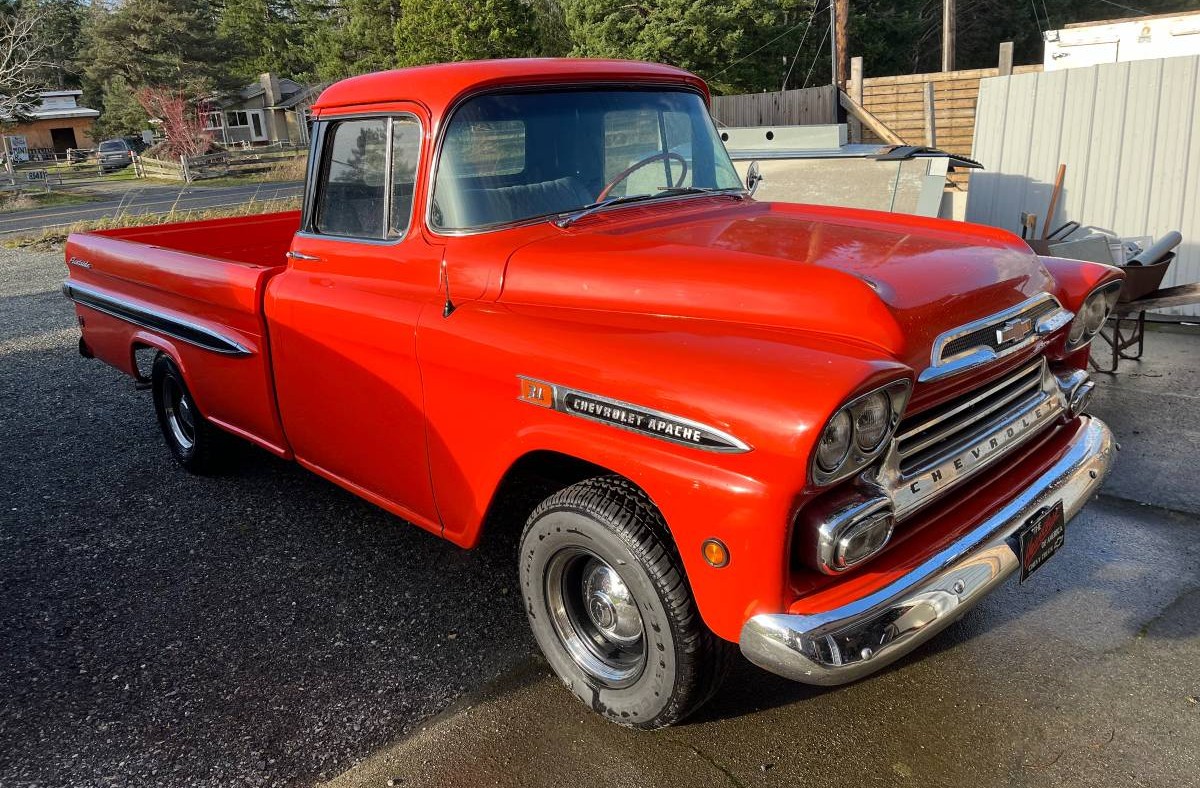 This truck has been nicely restored, and – in the process – gained a 350 cubic inch V8. We assume it took over for a 283 as that was the 8-cylinder of choice in 1959. The Apace has a 4-speed manual transmission and everything mechanical seems to have been rebuilt. Whatever may have been amiss with the body was taken care of before new red paint was applied. The wood in the bed looks great!