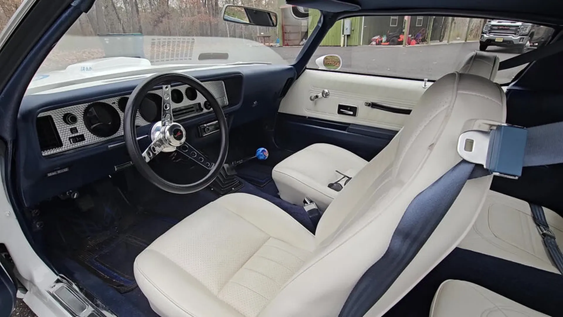 The interior is white, blue and black. It is basically stock but in excellent condition. The seller took some liberties by removing the console and changing to an aftermarket steering wheel. Also, a digital gauge package was installed in place of the analog gauges. The dash and lower door panels are blue while the upper door panels are white to match the seats.