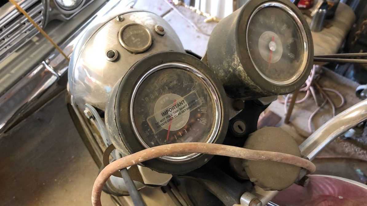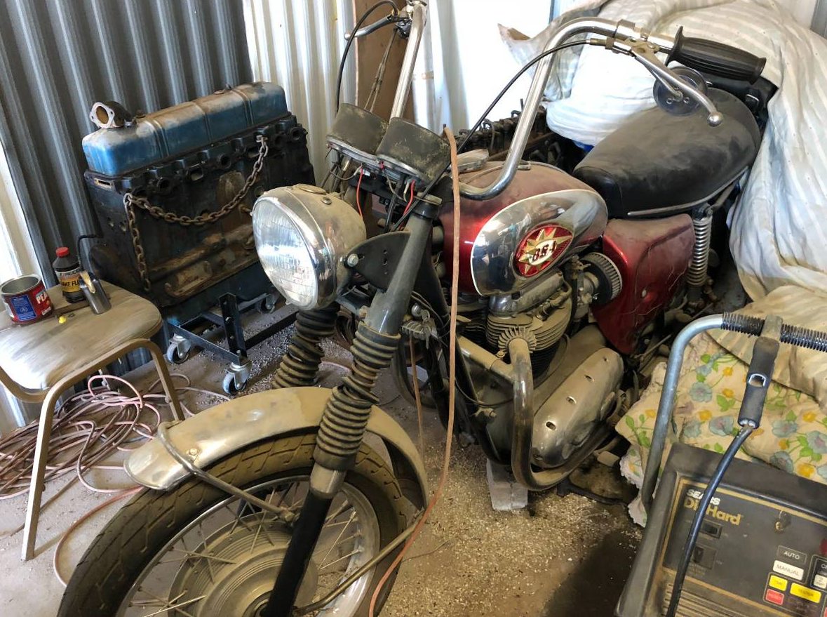 Sure is dusty for being covered. Funny the gators are rotted too after only 13 years of storage. This one needs a bit of paint work and some surface rust removed but if it isn’t stuck it should be ok. Clean out the tank and the carburetors, then tickle it good and give it a few good kicks. If Joe Lucas is a good boy it should start. I was always a Triumph man (Bonnieville and a Trident) and never cared for the looks of the featueless BSA “Water Melon” engine, too Buck Rogers, I liked the exposed pushrod tubes on my Triumphs prettier engines. Same reason I like my Harley and could never warm up to Victory’s featureless engine. I would Replace the Amals with Mikunis so you don’t have to run gas over the engine when cold starting. Joke used to be no smoking within 50 feet of my old Bonnie due to constantly weeping bowl gaskets and or tickling. Tickling by the way is the art flooding a cold engine by holding the float(s) open by means of a button on the carburetor’s float bowl. When properly flooded gas runs out of the vents, down the carburetor and drips on to your nicely chromed up engine side cases. Tickling the Triple you usually only did the outside carburetors because the only way to tickle the Tridents center carburetor was to use something like a pencil to reach in there. Those clever Brits :)