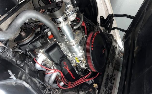 Under that bulging hood is a 350, but there isn’t much ordinary about it to report. On top sits a Weiand 144 supercharger, a unit that provides a substantial boost while keeping small blocks streetworthy. The performance upgrades don’t stop here, as this one also features some Edelbrock products, including a cam and aluminum heads. The exhaust flows through Summit headers into Flowmaster mufflers, with an electric fan keeping the radiator cool. The Turbo 350 automatic transmission has received a shift kit, and the 3.73 gears out back were probably a good choice for this application.