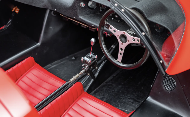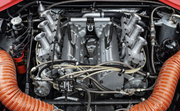 To understand the engine, we must backtrack: the development of Ferrari’s 65° V6 – spearheaded by Vittorio Jano and refined by Franco Rocchi – was aimed at ushering Ferrari into Formula racing with a completely new rear/mid engine configuration. Initially produced in 1.6- and 2.0-liter displacements, the motor was trialed in cars such as the 246P and 156F2. When Porsche entered Group 4 racing, Ferrari followed suit with the purpose-built 206 S, but Group 4 required a 50-car homologation, which Ferrari never met. Without homologation, the new 206 S would have been forced into the more formidable Group 6 prototype class. Aside from collecting a few good results at Targa Florio and Nurburgring, the cars generally competed in circuit racing and hillclimbs. The factory tinkered extensively with the V6 on behalf of its privateers: the Tipo 227 bore Weber carbs and two valves per cylinder for output of around 220 hp; the Tipo 231 was configured with three valves per cylinder (two intake, one exhaust), good for over 235 hp; and this final version, equipped with Lucas injection, registers 270 hp. The Tipo 233 was apparently fitted to only two 206 S chassis, though the second recipient is somewhat of a mystery. Mounted longitudinally in the rear, the 2.0-liter, all-alloy, DOHC construction shed the twin-plug spark arrangement of earlier Ferrari V6s, minutely simplifying its maintenance. A five-speed non-synchro gearbox transmits power to the rear wheels.
