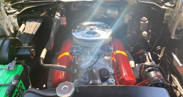 This a nice looking car but to my eye the two-tone paint would look better. It’s unfortunate the dash and package tray have been hacked up. The same can be about the driver’s side A pillar. The spotlight might be period-correct but it wasn’t a RPO. There is one flaw I could not live with which is the stainless below the clock.