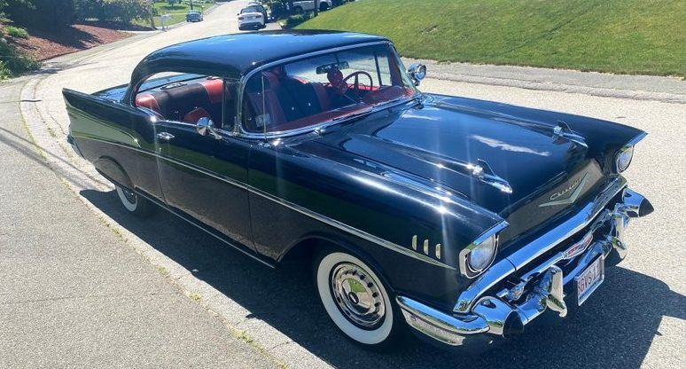 I would not use the word ‘restored’ to describe this car. In 1957 available automatic transmissions were two speeds, either a Powerglide or a Turboglide. The trim tag indicates the car was originally a two-tone in Onyx Black and India Ivory.