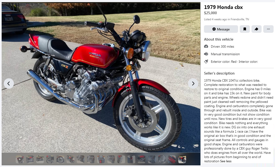 With mostly vertical photos that are cut off, other than the first one, it’s hard to get an overall look at the beautiful restoration of this superbike, and that’s super unfortunate. But, as with the rest of 2025, it is what it is. This incredible 1979 Honda CBX can be found listed here on Facebook Marketplace in Friendsville, Tennessee, and they’re asking $25,000. Here is the original listing, and thanks to PRA4SNW for the tip!