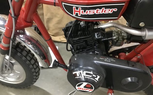 Here’s the clean-looking Tecumseh HS40, a 172-cc single with 4-hp and it seems to run great in the seller’s video. It uses a torque converter clutch as you can see by the decal on the cover in the photo above, so no shifting. This is a great transition “motorcycle” between a basic mini-bike and a regular motorcycle. Have any of you owned a Rupp mini-bike?