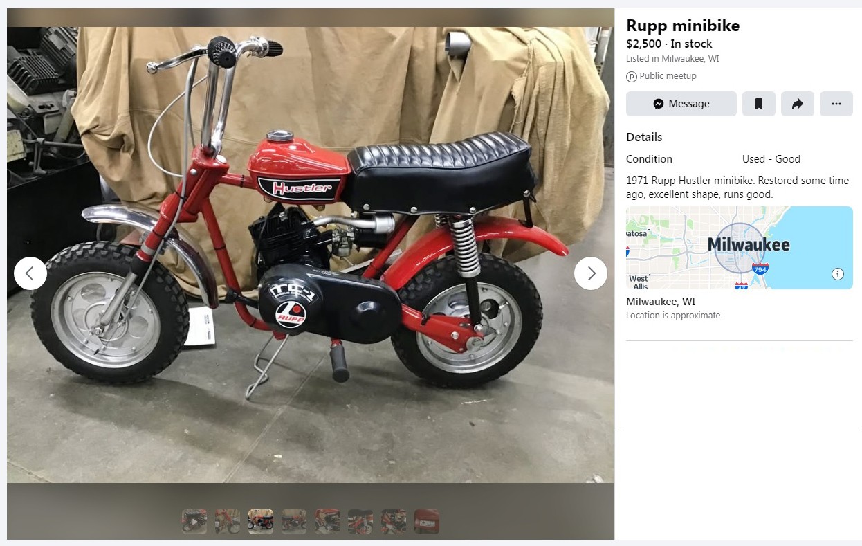 “Curiosity and innovation” were the two words that Herbert Rupp (known as Mick or Mickey) credits for his success in the go-kart, mini-bike, and snowmobile business in the 1960s through the 1970s. This 1971 Rupp Hustler mini-bike is listed here on Facebook Marketplace in Milwaukee, Wisconsin and they’re asking $2,500. Here is the original listing, and thanks to Lothar… of the Hill People for the tip!