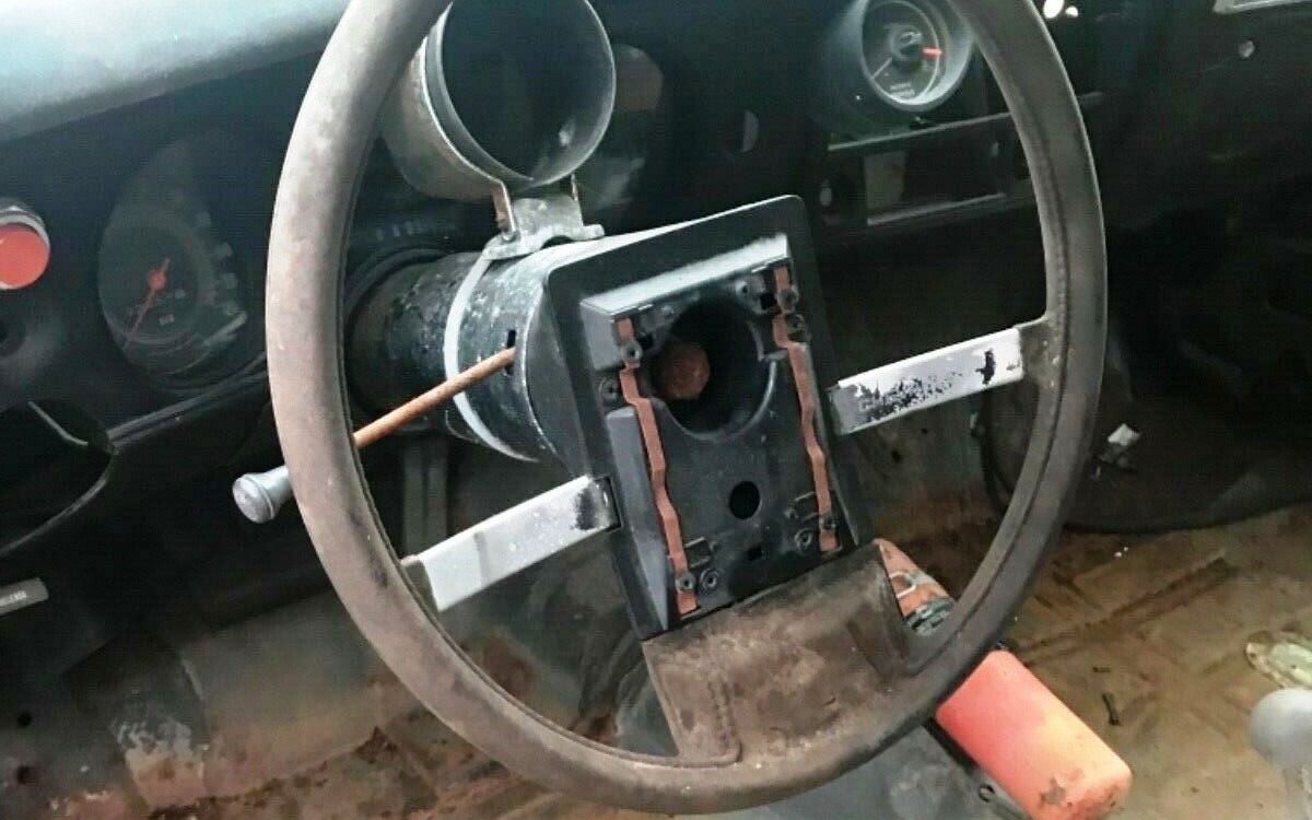 The spartan interior pays tribute to the car’s drag racing past with the hollow housing of a prominent aftermarket tachometer, fire extinguisher within reach of the driver, and what looks like a kill switch on the dash. Last raced in 1993, it evidently gave up parts for other projects until someone felt it was old enough to possibly fetch a buck or two.