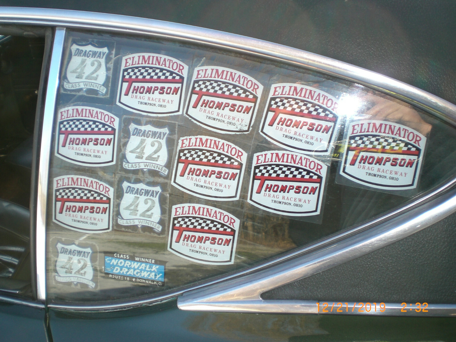 Here is a great shot of the car in action. You can see a bit of daylight under the front tire, which is fairly impressive for a car this heavy. The dozen-plus window stickers indicate at least some consistent racing history. Raced under several names, the last was “Rat Attack” where it featured fiberglass fenders.