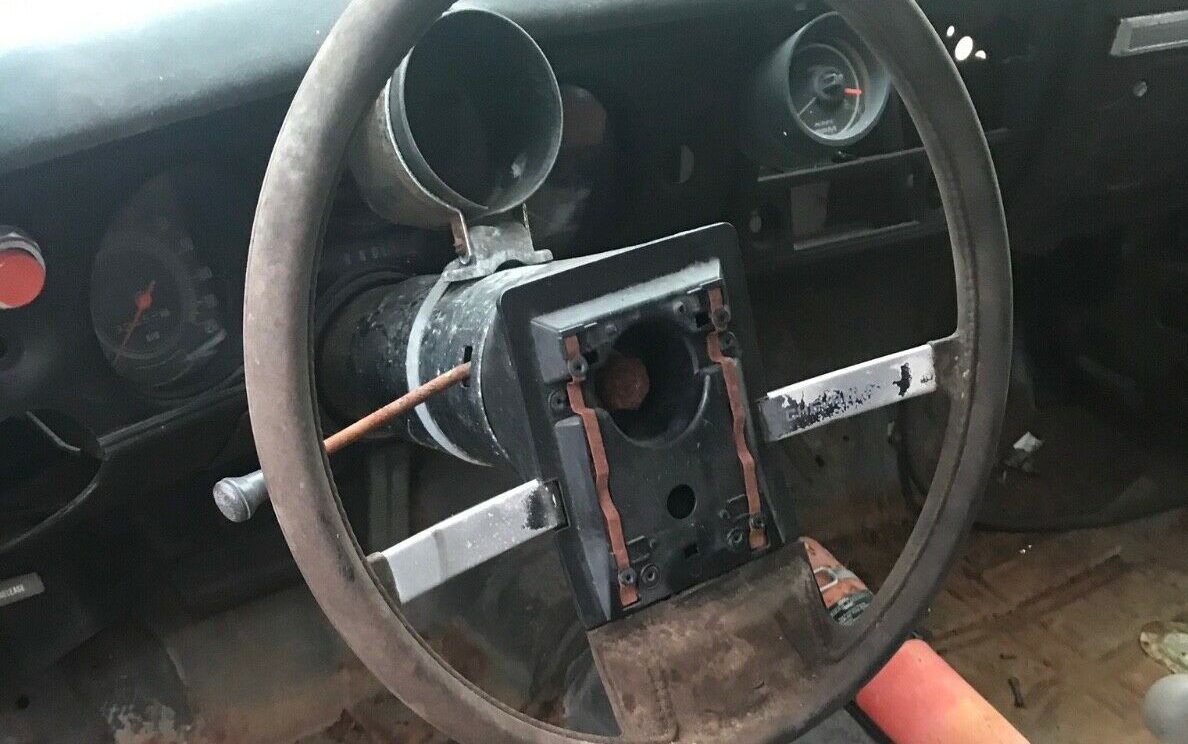The interior is almost completely stripped of the door panels, seats, and carpet. The headliner is still there, but it needs to be replaced. Also, there was a bolt-in roll bar that has been removed. You can also see what appears to be a tach housing bolted to the steering column that no longer contains the gauge.