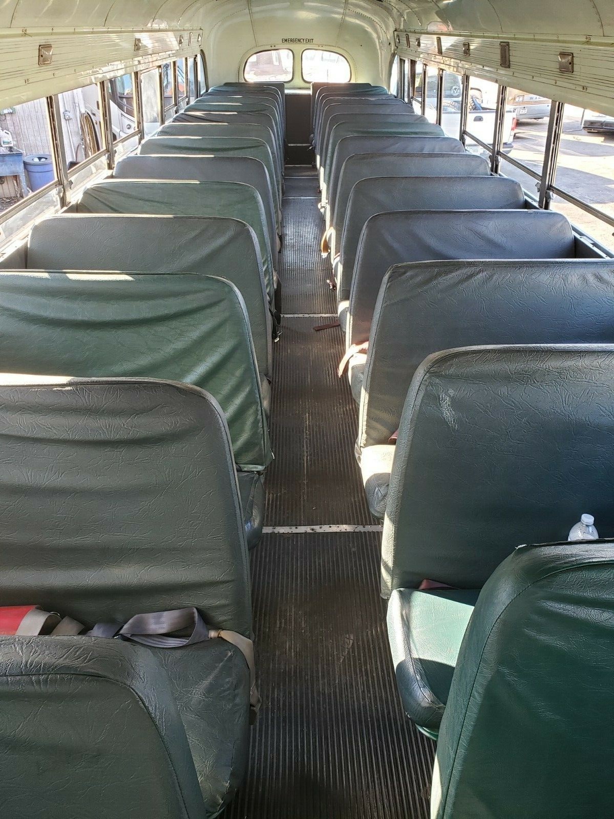 They left the first two rows of seats and made like a giant El Camino of sorts. The guy hauls travel trailers/campers and dead heads hauling cars. He took it on a three week maiden voyage when he picked up my car. It was so new that it was still painted yellow (what was left) Which is a no no. He got pulled over in Atlanta and the cop wasn’t amused. Even though the rear section of the body was customized with a dovetail the front still yellow. Can’t impersonate a school bus.