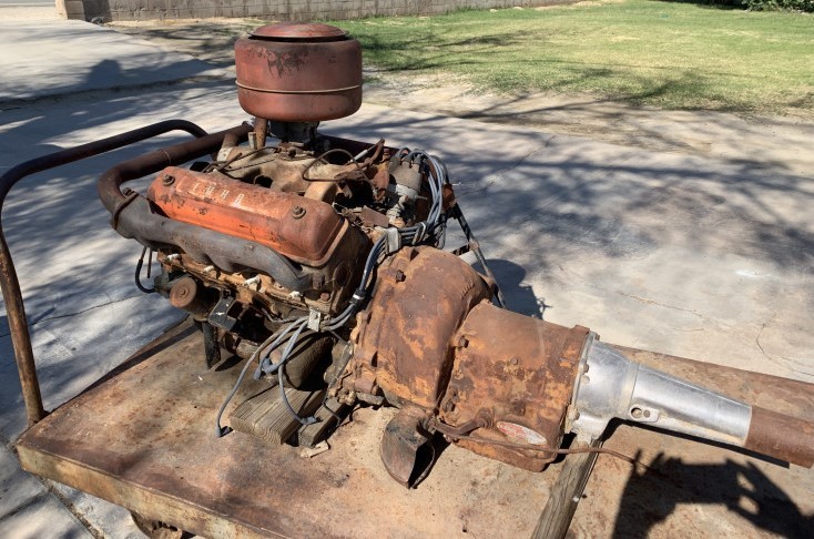 That engine and transmission being thrown in with the deal aren’t the originals from the car being offered here. That crossover at the upper front of the engine was last used on Ford and Mercury cars in 1956. The canister type oil filter was also last used on the cars in 1956.