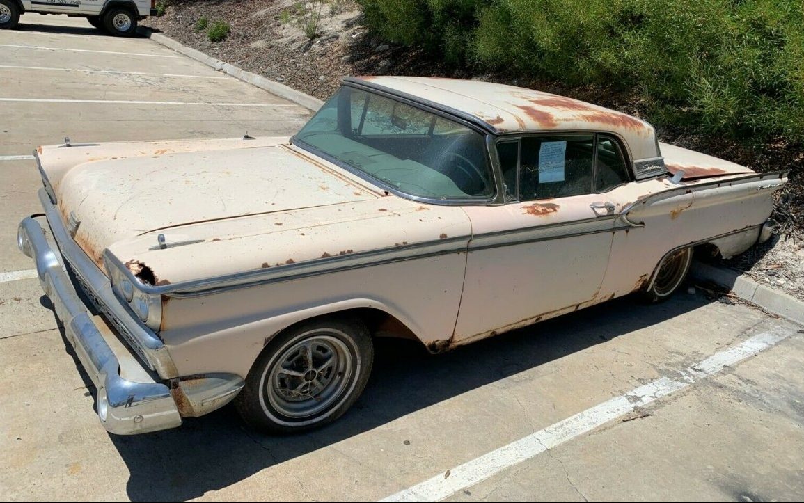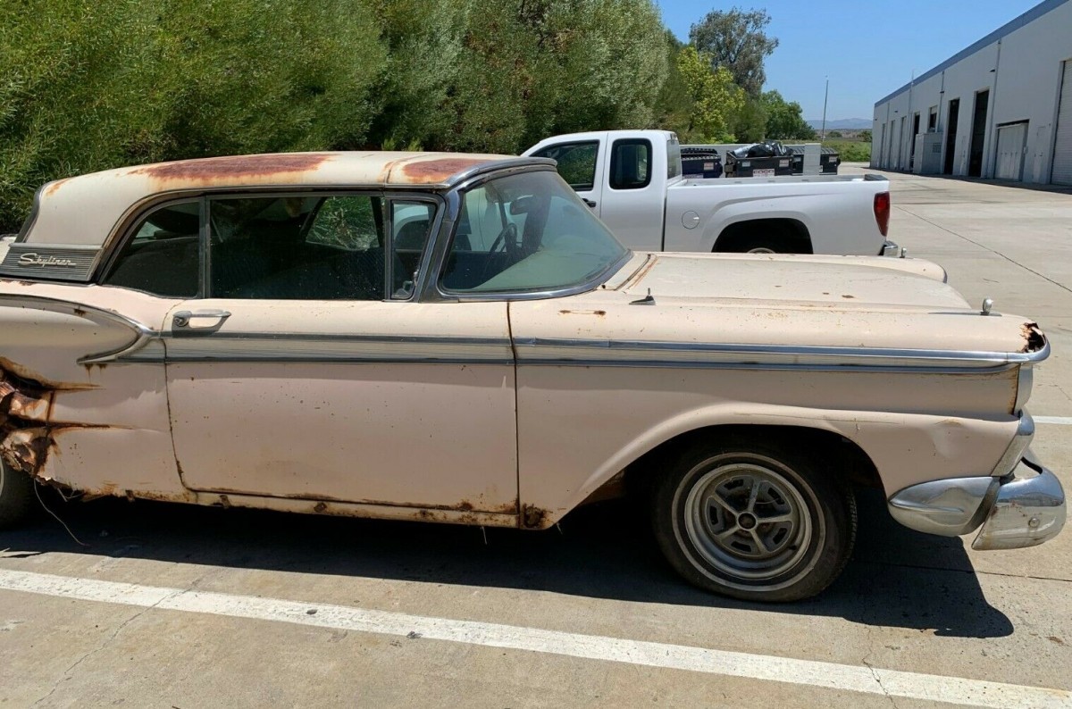 On the good news front, the car appears to still run as the seller tells us it was driven onto the flatbed trailer used to bring it from a “barn” to where it is now. But it didn’t do it very well because the gasoline in the fuel system is about as old as the car itself. There was more than one engine choice for the 1959 Skyliner and this one has the 332 cubic inch V-8 that would have been good for 225 hp back in the day. The engine is paired with Ford’s Cruise-O-Matic transmission and a 3.10 rear end.