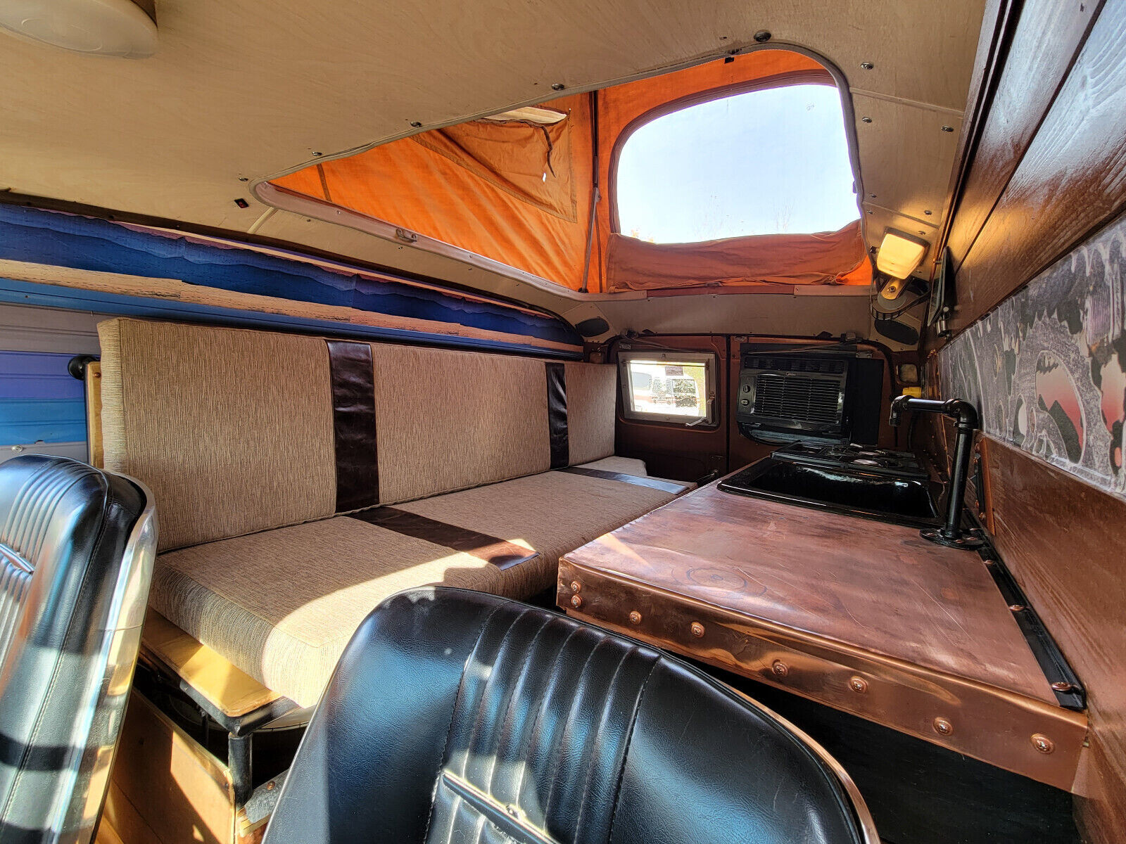 The seller retained the bones of the previous owner’s Camper conversion, refreshing and updating features utilizing a “Steam Punk” theme. The 1970s carpet made way for vinyl timber flooring, the countertops are copper, and the drawers and doors feature industrial motifs. It presents well, with fresh cloth on the seat and the timber refinished to a high standard. However, the practicality of this interior can’t be underestimated. Lighting is provided in 12- and 110-volt fittings, perishables are kept cool in a mini fridge, and a two-burner cooker and a black-finished sink with a sixteen-gallon fresh water supply and a gray water tank round out the owner’s catering needs. A window-mounted air conditioning unit keeps the interior cool. There is ample storage space under the seat, which folds into a bed that accommodates a six-footer. Rounding out the package is a porta-potty for when nature calls.