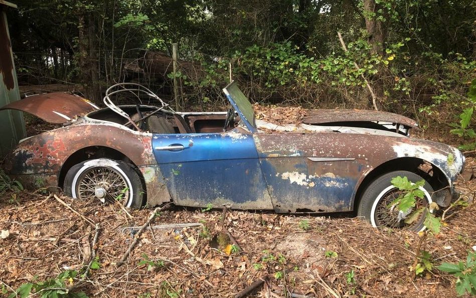 Beyond opining about this Healey’s suitability as a restoration subject, no other details are offered via the listing. Besides the obvious, as in the missing parts, the dents, and rust, it does appear to be returning to primordial ooze. None of the body parts, as they sit, appear to be useable so one can only imagine how the structural aspect of this Austin-Healey’s underside has fared. It would be interesting to know how many different colors and paint jobs have befallen this iconic British sports car. The most recent cover-up looks to have been a rather conspicuous shade of metallic blue but even that turned into a nevermind as it appears to have been mostly removed with a scouring pad. I guess the refinisher gave up when he got to the passenger door.