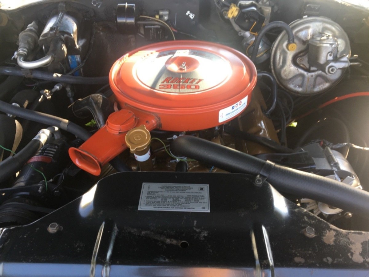 Under the hood is the Rocket 350 4BBL engine matched to an automatic transmission. The car is fitted with power steering and power brakes and everything under here is original from the factory, right down to the original alternator. The car also rolls on nearly new Coker Red Line tires fitted to the original Rally Wheels. The original spare tire resides in the trunk.