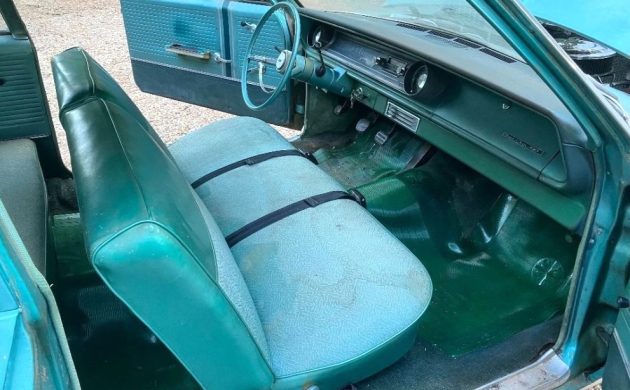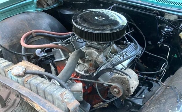 The sparse interior has managed to hold up with no damage from furry pole barn dwellers. A new headliner is needed, but the rest seems passable. As the original engine was bad, the seller dropped in a 307 V8 he/she had on hand (from a 1969 Camaro). It runs well and comes with some bling to dress up the engine bay. Headers and “Cherry Bomb” mufflers were added (a rat rod wannabe?). The tranny shifts as it should. The seller had plans to put in a 396 with a 4-speed, but changed his/her mind. The car comes with a current Alabama registration (no titles issued on vintage cars).