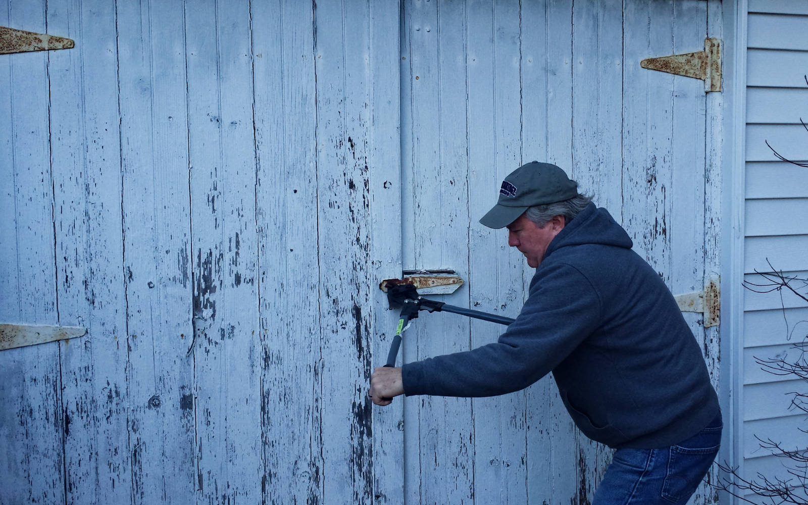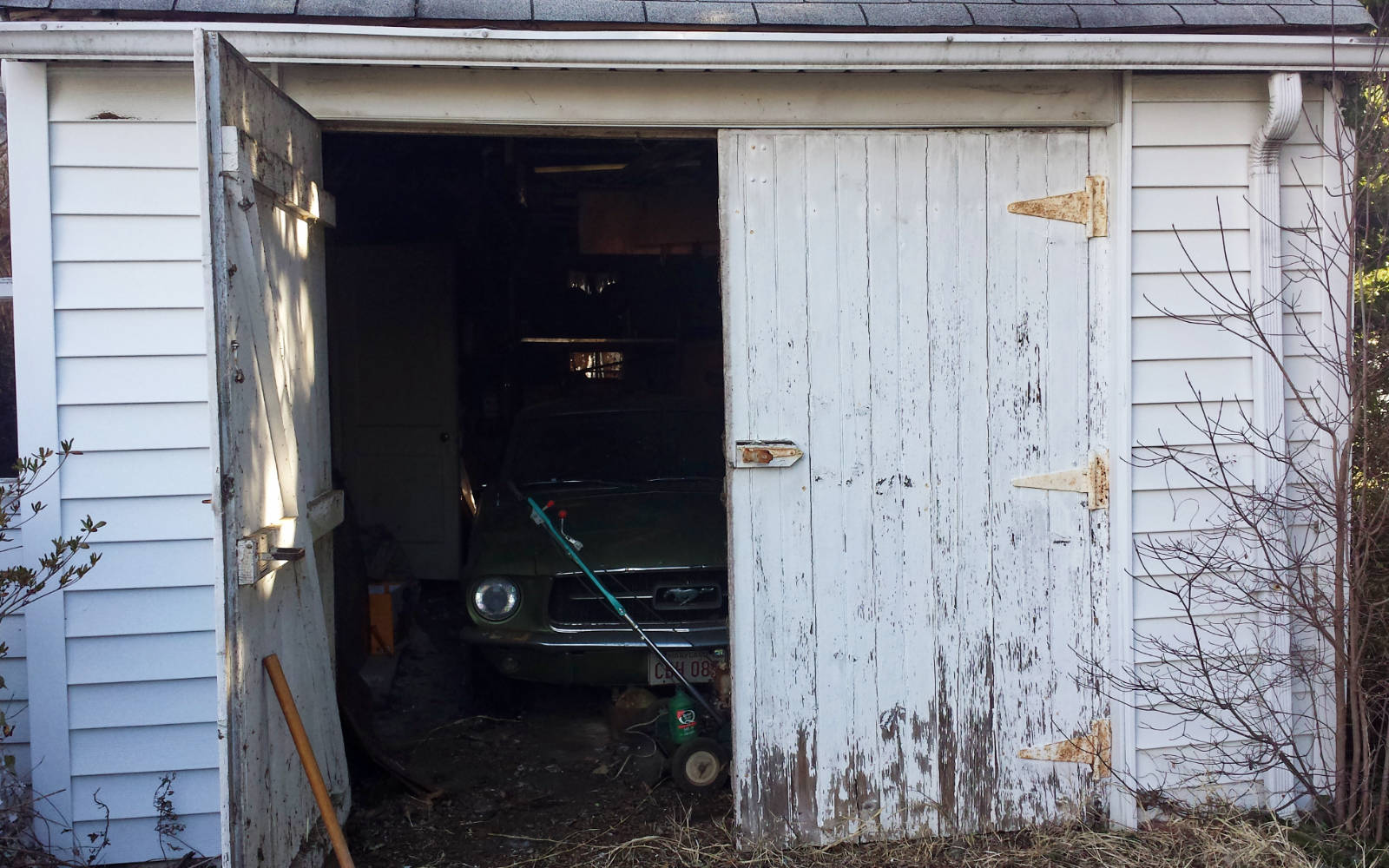 She prepared me for the likelihood that the tires would be flat, and that I’d need a bolt cutter to remove the lock, so I brought the necessary tools, air tank, and a spare set of Mustang wheels/tires just in case. What neither of us considered was the fact that over time, the driveway heaved up and blocked movement of the carriage house swinging doors. We had to use a sledgehammer to break up the blacktop and remove the weeds blocking the doors. I had my boys take pictures of the big reveal since this is really a once in a lifetime opportunity – to extract our very first Barn Find together – as a family.