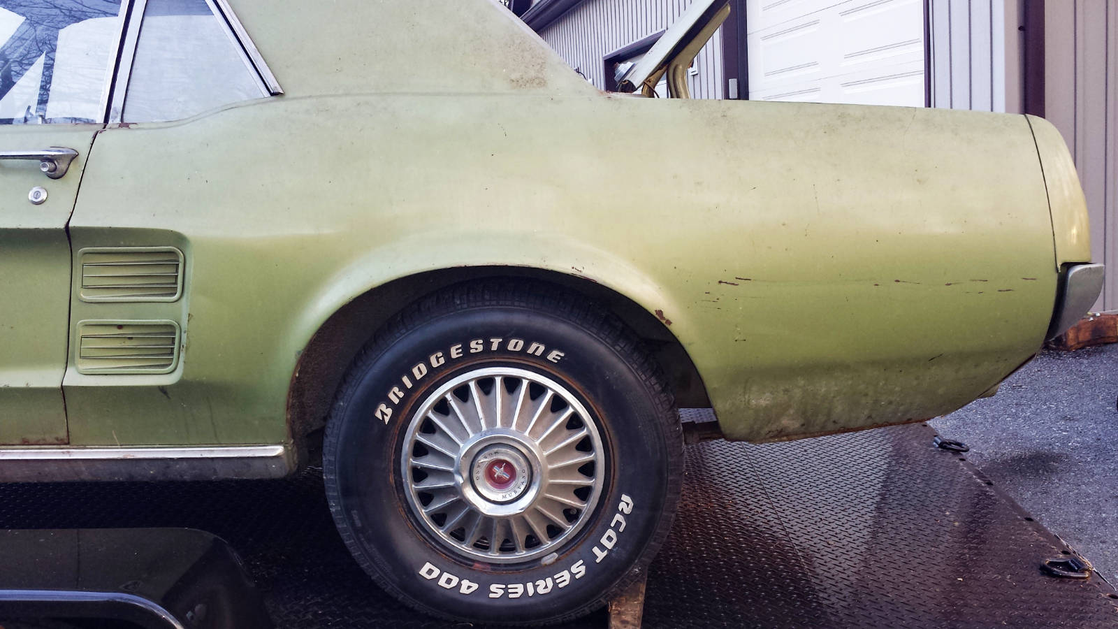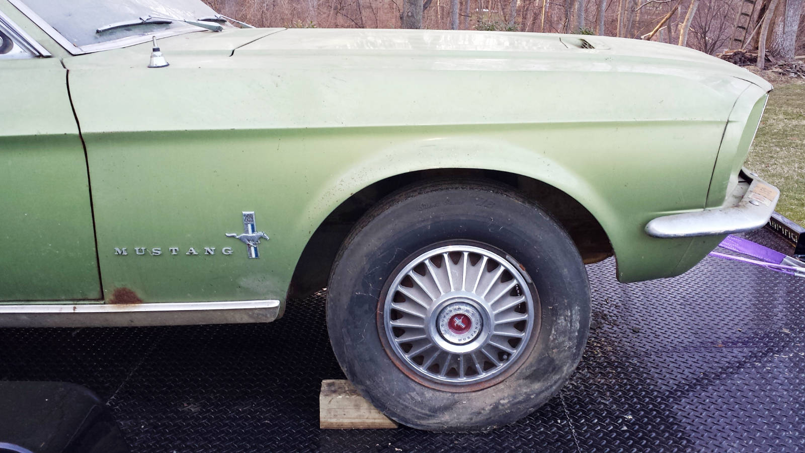 After removing old lawn equipment and gaining access to the car, all four tires were indeed flat. The front tires accepted air and remain inflated today. The rear studded snow tires would not take air, so we installed the 2 “rollers”.