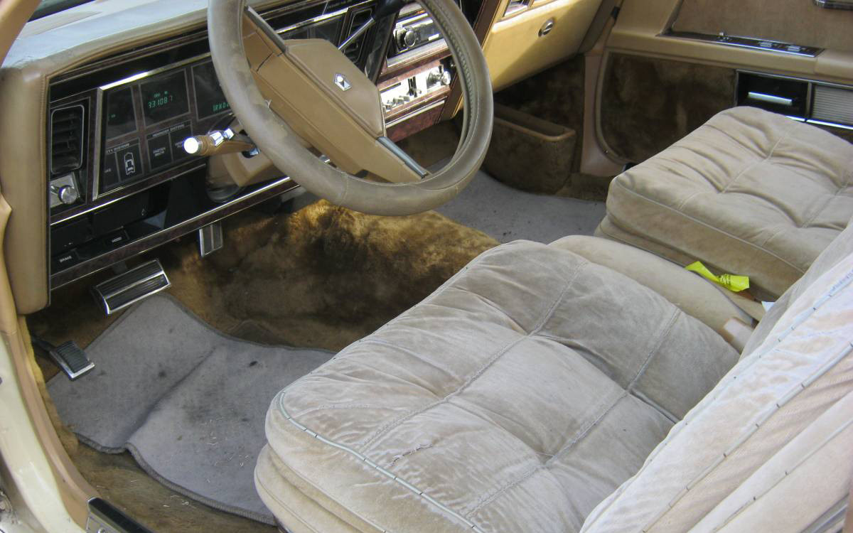 Ok, I admit that compared to the heavy, supple, chrome-laden, Imperials of yore, the sixth-generation cars are easy to pick on. In the early-1980s, bustle-back styling was somewhat of a thing and the Imperial wore it maybe better than anyone else did. This car doesn’t have leather which we almost always expect to see in a luxury car now, but overall it looks good inside. They show a close-up of the driver’s seat which needs some help.