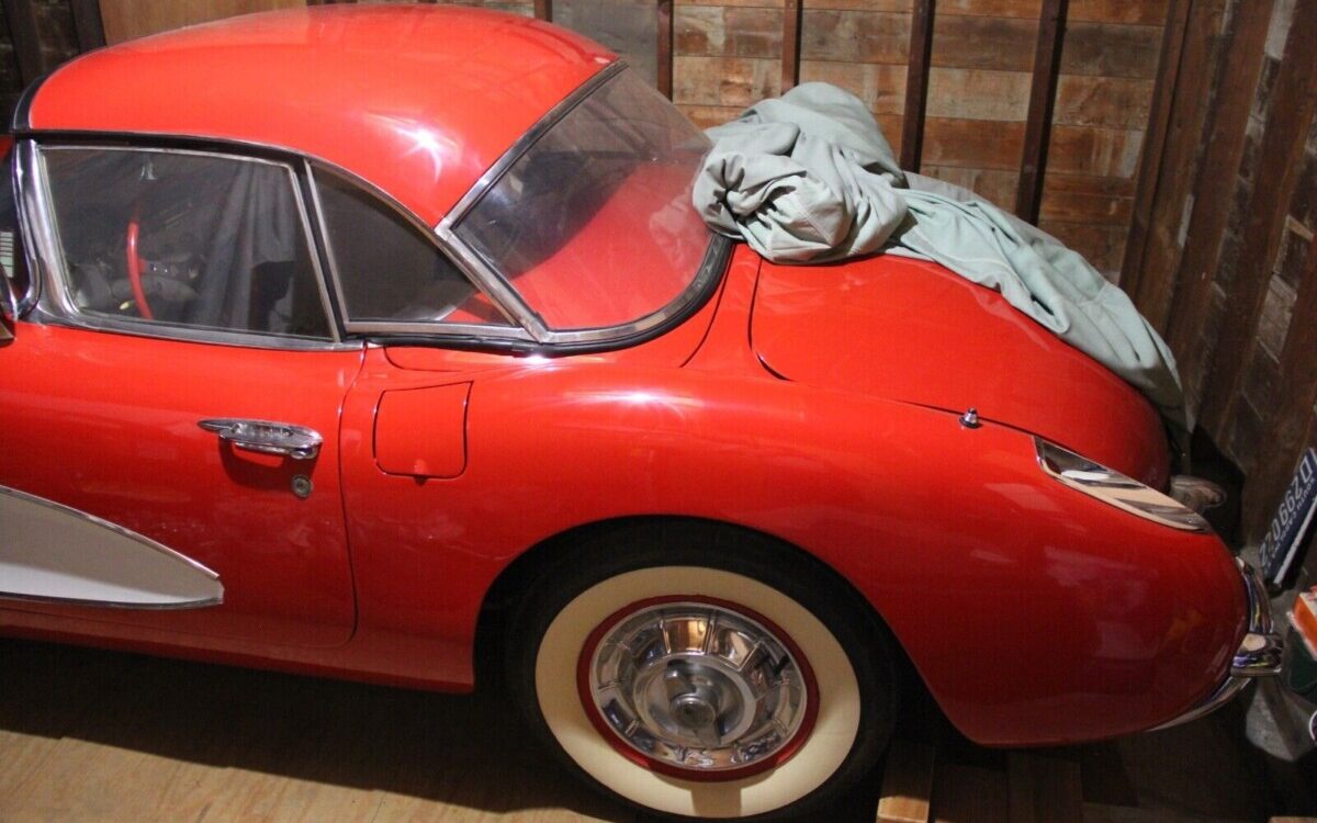 Sitting on plywood since 1987, it would seem that this Corvette has seen little action over the last 35 years. The images present a clean and sound body with no evidence of seam splits, cracks, or spider webbing. The seller claims that the frame is “great“. The image of the underside looks OK but it seems that someone got overly enthusiastic with a paint sprayer or rattle can as the mufflers are showing overspray. And while we’re under there, the Delco-Remy starter has been painted orange – again, overspray from an oil pan refreshing? These are minor matters but true Corvette aficionados and experts would likely have some angst over such deviations from original. Of note, there is no folding top included, just the removable hardtop.