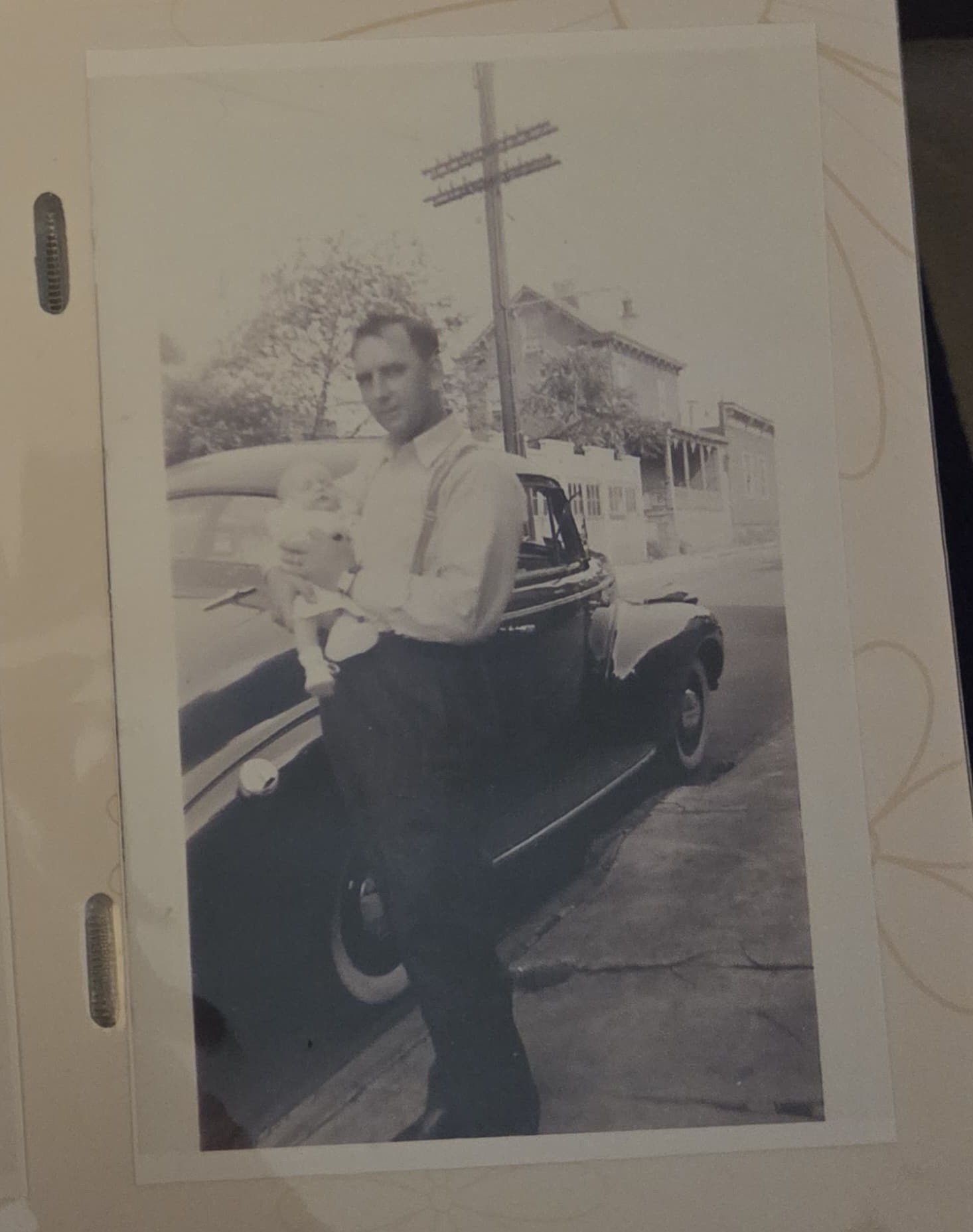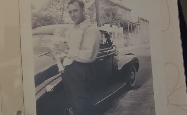 I hope this comes out. This is a picture taken in 1941 of my Dads father holding my Dad as a baby in front of his 1940 Chevy. Not a great picture of the car, but its all I have.