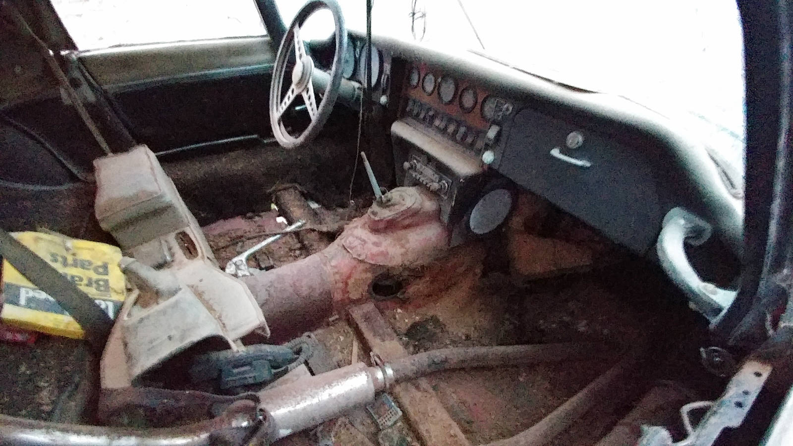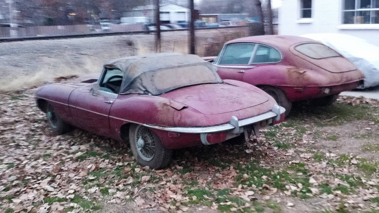 Seriously, these Jags had to have just been pulled out of a barn. They are covered not just in dust, but mud that has been there for a long time. Since it was early Sunday morning when I spotted them, the owner of the shop wasn’t there and I haven’t had success getting a hold of him yet, but hopefully we can catch him at the shop to find out what the story is. Both cars are in pretty rough shape, but we’ve seen plenty of E-Types in worse condition restored.