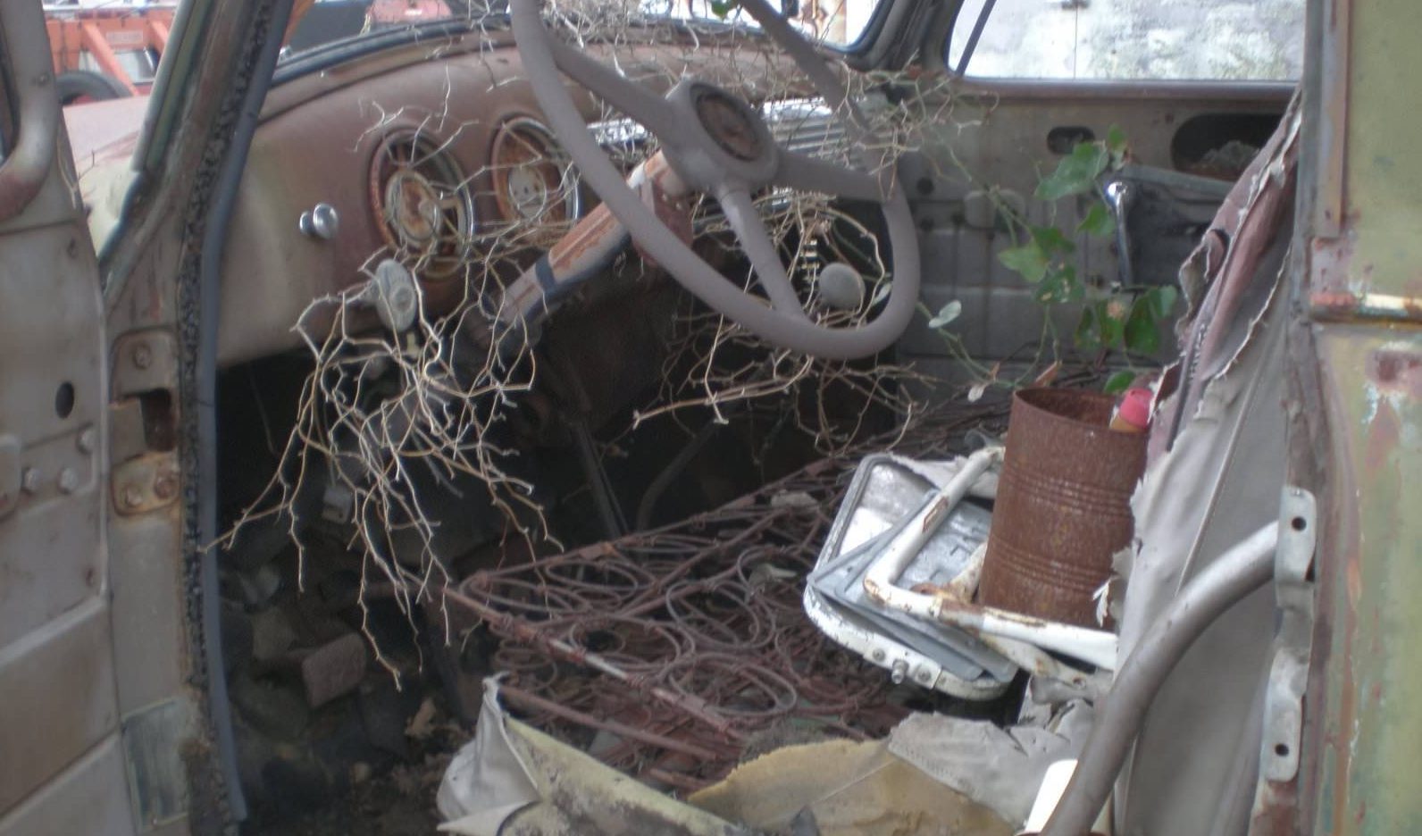 The interior – well, that’s another story. This is the ugly side of dry, sunny climates like Colorado and Texas. The seat cushion will just need to be yanked out and replaced, along with whatever brambles are poking their way up through the cabin. The seller pulled this Chevy out of Trinidad, Colorado, which is practically on the New Mexico line. It makes you wonder how many stranded travelers (and only Chevrolet owners, please) this rig pulled to safety or out of the desert heat.