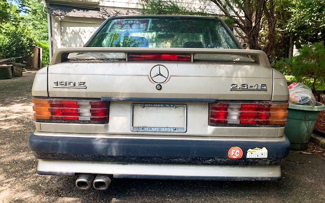 From Francis In Douglaston – I grew up in Jamaica Estates Queens, New York and I remember when my friends neighbor brought this exact car home. The owner let us come over to see the car and took the time to explain the difference to us from the standard 190E, being a 10-year-old boy interested in cars, I fell in love with it and always wanted it. He recently put it up for sale and when I called him about it he was asking a very high price. And unfortunately, there was no discount for remembering when he brought the car home and my yearning for it all these years. I can say the car was always outside and recently covered with a tarp for a few years. In reading about Jeff’s dealing with one of these Mercs and him saying these cars rot from the inside out I passed on buying it. Ironically, I finally have a two-car garage and the space to work on it, but I can’t justify it. Having 3 kids and a minivan you would think I could treat myself to this particular car! Hopefully, a fellow reader can at least save it.