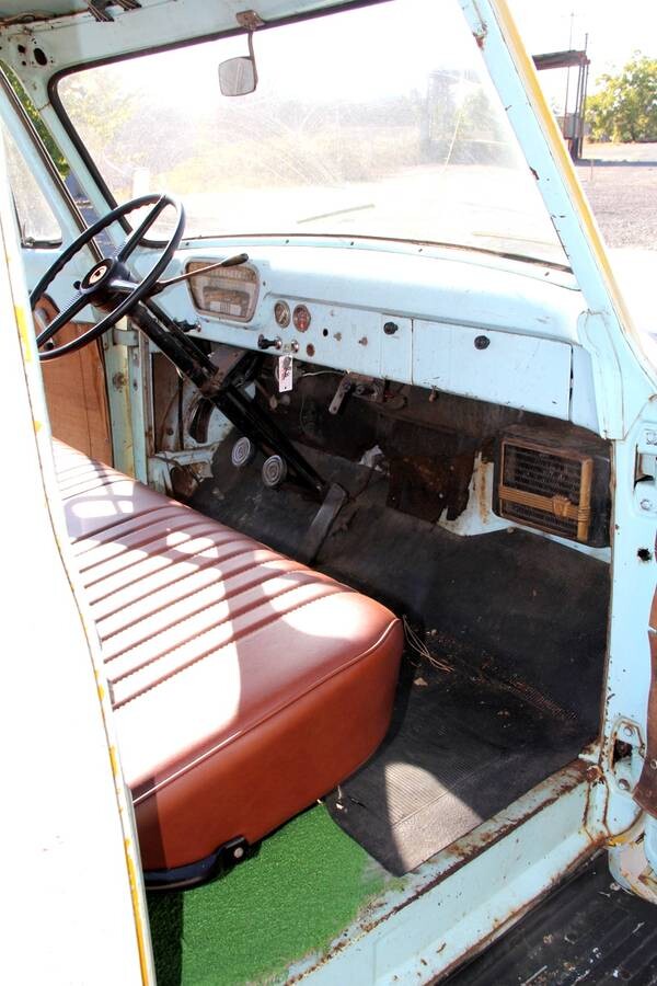 Great looking truck. One of my older brothers had one back in 59. His had a 272 V8 three on the tree. It had a 6″ drop axel up front with reversed rims painted gold, exterior color White with red tuck n roll interior. If this were mine the heater box would be removed and vintage air installed. under the hood would be a modern turbo charged V6 and tremec 6 speed, Mustang II front suspension with 4 wheel disc brakes. I like the seat that’s in it so color choice would compliment inside and out. I have a vision in my mind about the finished look and driving experience of this truck. But unfortunately my health is declining these days making new projects just a dream.