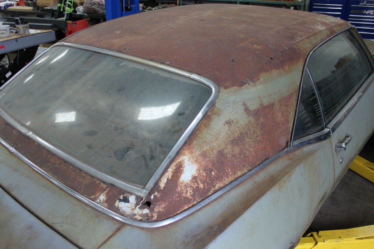 Holes in the roof and you call it rock solid?? OY vey, the underneath is clean but as Jerry z says, every panel in the car is bent- looks like the fork lifts in the Junk yard had a field day, but it is a lot more solid than most we see here. Whats not rotten is bent. Too bad, I’m sure some one will take it on! Good luck!