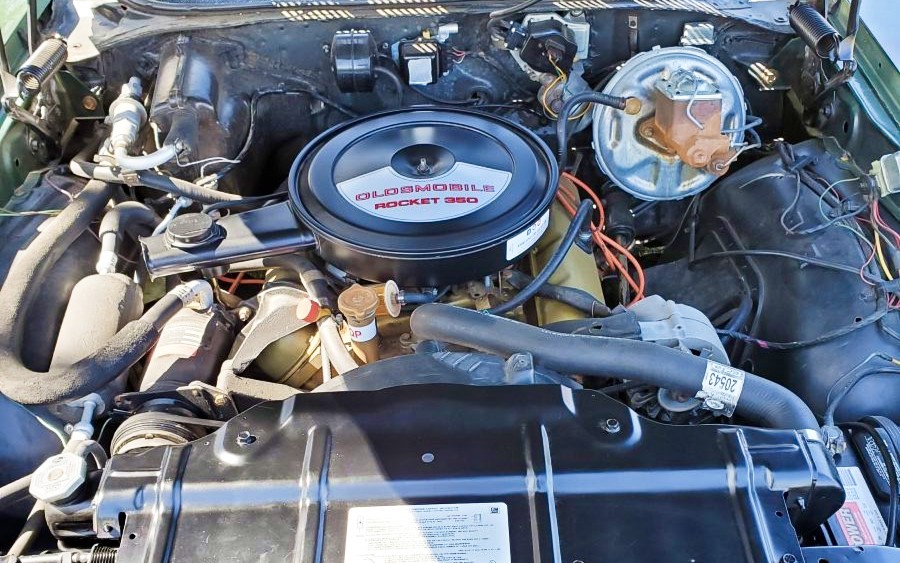 Whether it’s 6k or 106k, this is one tidy engine bay! It’s packing the Rocket 350 V8, which was rated at 250 horsepower. The engine is painted the correct gold color, the air cleaner is correct and all the factory stickers look to be in good condition. Perhaps it really is a low mileage car? And we want to know if the AC still blows cold!