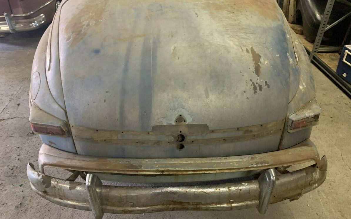 Unfortunately, our subject car doesn’t appear to be big on comfort these days. It looks as if someone started some disassembly, perhaps with the thought of refurbishing, or a repaint, and then stopped. What’s here is in OK shape though there is surface rust present as well as some rust-through. The seller makes mention of the garnish moldings that are present but not the ones that are absent such as the trunk lid trim and the headlight bezels and buckets. The intricate grille shows to be intact, a nice discovery, it’s just dull with age. The seller mentions that the convertible top frame is complete including the latches. Also, extra fenders are included in the sale and the seller claims, “ALL OF THE HARD TO FIND COMPONENTS THAT ARE UNIQUE TO A CONVERTIBLE ARE HERE“.