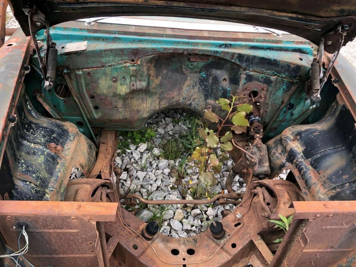 The windshield and door glass have been broken, but the other pieces are good and so is the exterior stainless trim. The interior has been stripped and – in an unusual move – someone has converted the steering column to the tilting variety, not an option that Chevy would offer until the 1960s. The rear end is not original to the car and may have come out of a Camaro; the leaf springs have also been relocated (was the car perhaps intended to be a racer at one point?). While the seller has had the car awhile, he only recently had the title changed to his name and is waiting for that to return via the USPS.