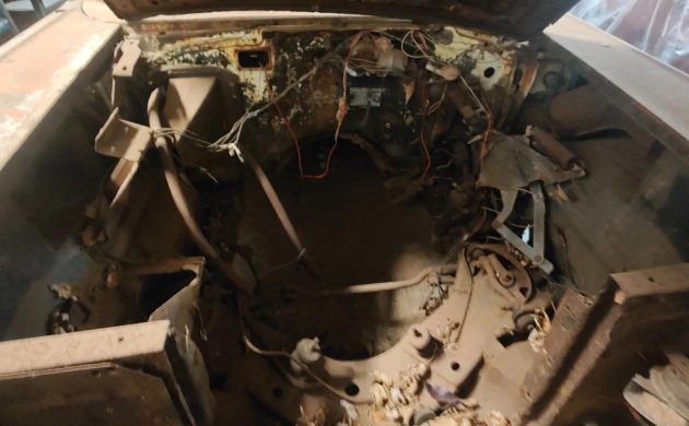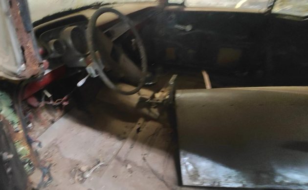 This interior photo is a bit blurry, but it’s clear enough to show that quite a few items are missing in here. However, it also appears that work may have already been performed on the floors, but there’s no info regarding the condition of the rails or anything about the platform. I’m not sure where that steering wheel came from, but it probably needs to disappear in favor of a correct component, or something cooler if it’s a Restomod you’re going for.