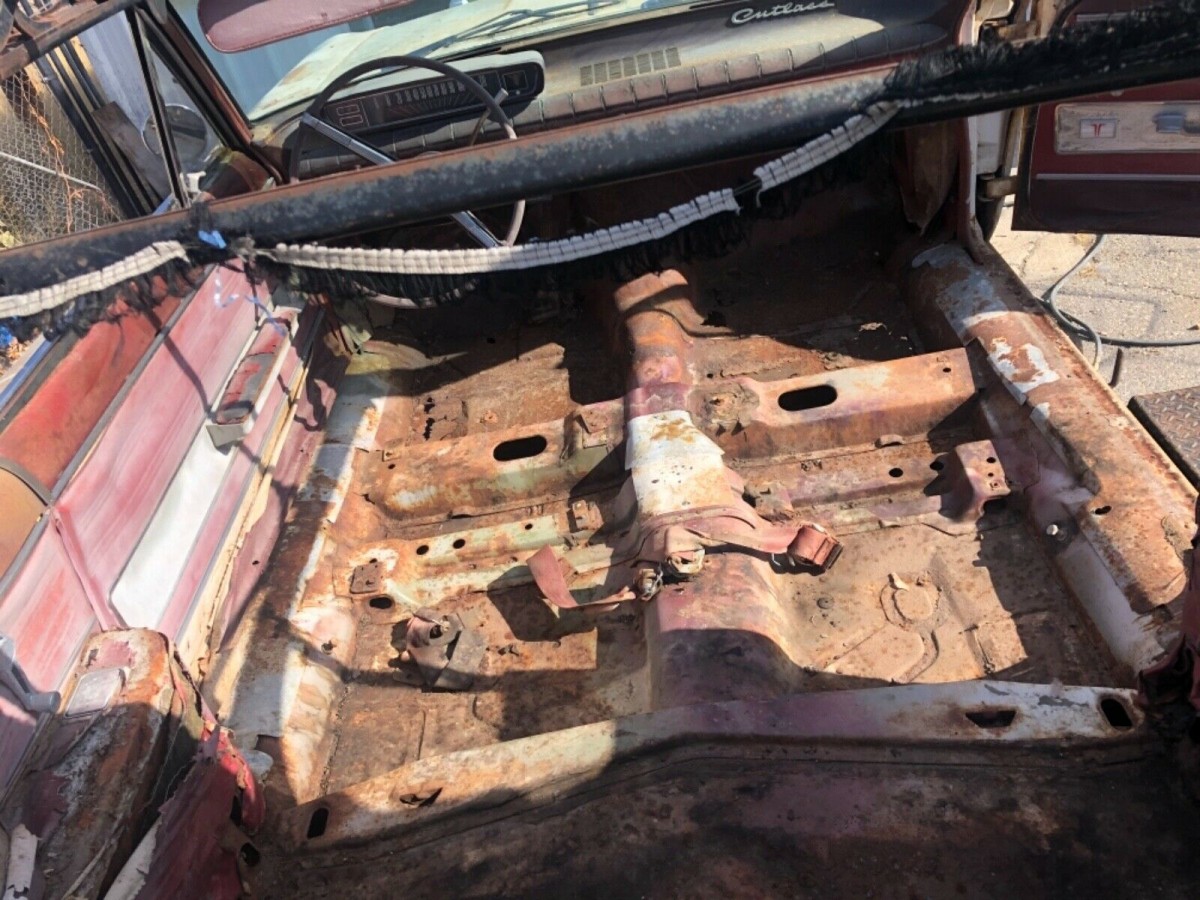 The body on this ’62 Cutlass looks to be good overall, with a limited amount of rust present. The front grille and headlight assembly was removed but it included with a bunch of parts, and the convertible top is limited to just hardware at this point. The rear bumper is dinged and bent, so it will have to be replaced. There is an abundance of surface rust on the trunk floor, but none seem to have turned into holes. The same can be said of the passenger floorboards, where the seats have been removed (they come along but are very, very rough).