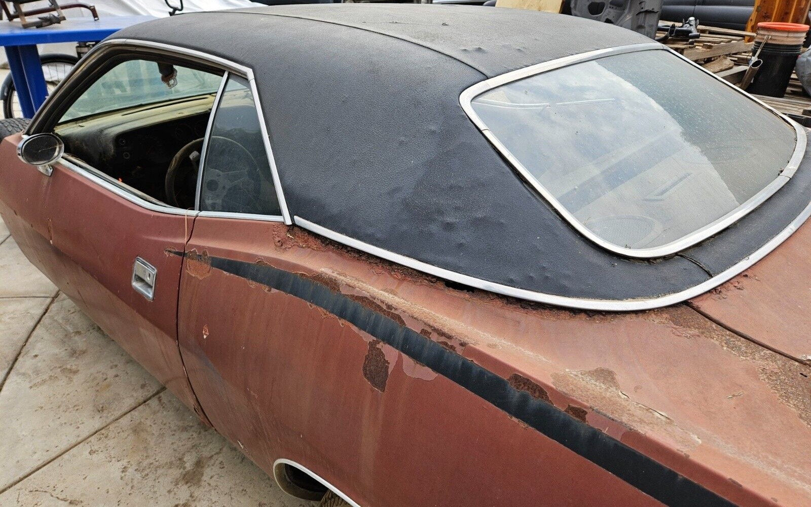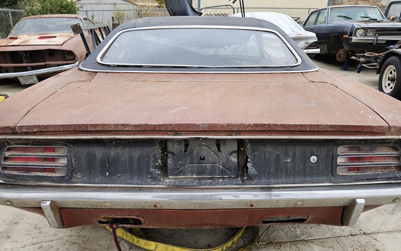 This one’s missing the original front clip, and what’s remaining of the body appears like a lot of it has been contaminated by the vinyl top, so who knows how much roof will be left once that’s gone. Just be up to date on your tetanus shots before you begin removal, and watch out for that stray razor blade that looks like it’s been living on the trunk lid since the seventies.