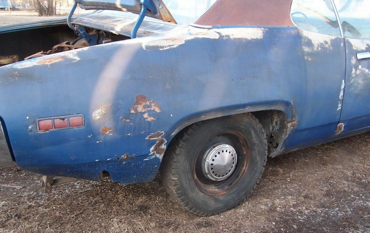 The seller’s Road Runner is going to be popular with your local body shop because there are lots of areas to be dealt with. The bad includes the driver’s side front frame rail and the torsion rail on the passenger side (the suspension sags on that side of the car). The rear frame rails aren’t as bad, but there is some swelling around factory holes. The quarters and fenders have all been chewed on. The front floorboards and front aprons will need attention. However, the rear floorboards, roof and cowl are said to be okay. To paraphrase the seller, “if you’re looking for a car that need no work to the frame, this one is not for you.”