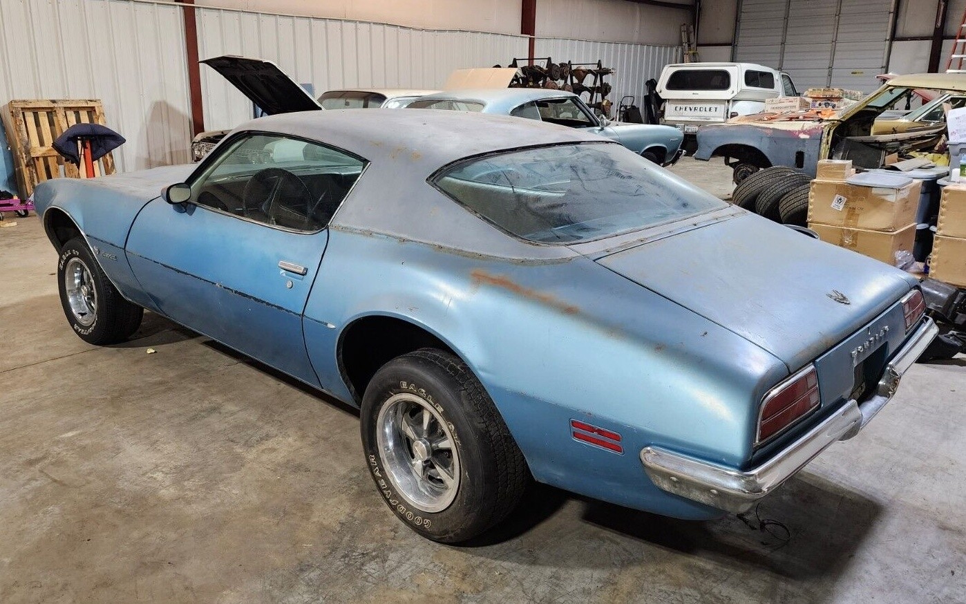 We don’t get very much background about the Firebird, other than one mention that it spent a period of time in California at some point, but the seller assures us the body is solid and at a good point to begin your restoration. He mentions some dents and dings in the sheet metal along with several paint imperfections, plus this one was a factory vinyl top car which resulted in some rust around the rear window before it was taken off. The exterior definitely shows patina, which looks especially cool on the hood, but with the fabric removed and primer on top, I’m thinking a respray is the way to go here rather than leaving the aged finish outside.