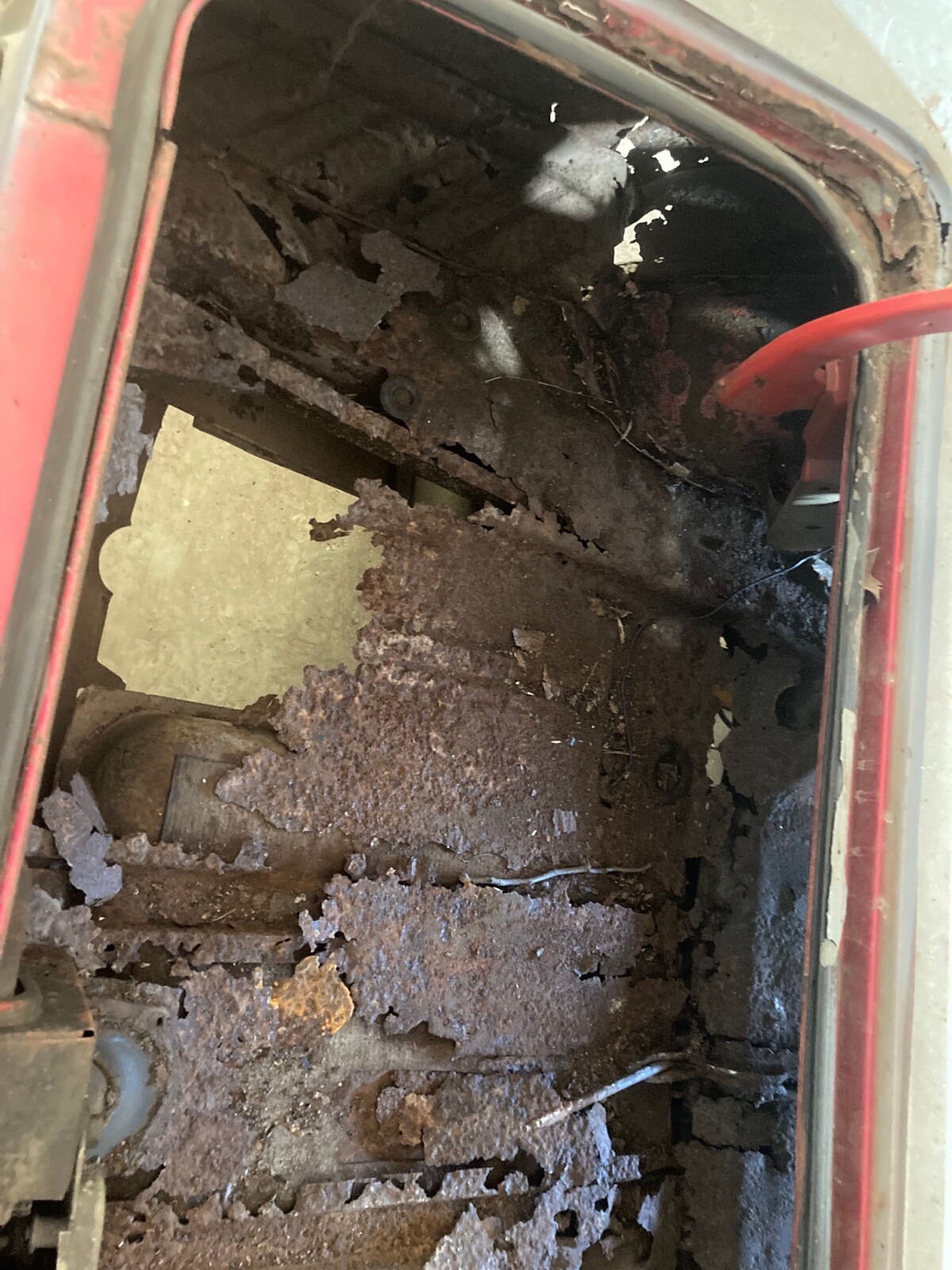 There’s no fender tag present, but the “G” in the VIN indicates a 318 cubic inch 2-Barrel, although the motor is long gone. The good news is that this was a manual transmission car, but that’s gone too, however, the 8 3/4 Sure-Grip is still present. Compared to the outside, the engine area looks better than I would have thought and still retains the car’s original color of red inside. This was a manual brake Barracuda with front discs.
